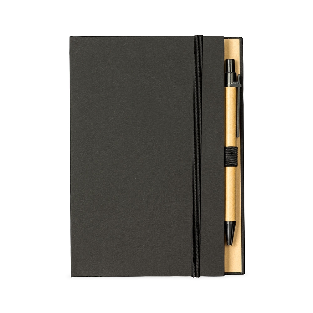 Um bloco de anotações com capa revestida em papel especial e fita elástica para fechamento. Contém aproximadamente 80 folhas amareladas destacáveis com pauta, além de um bloco com cerca de 20 folhas autoadesivas amarelas e aproximadamente 100 marcadores de página autoadesivos, divididos em cinco cores diferentes. Acompanha uma caneta esferográfica com carga azul de 1.0mm e acionamento por clique, corpo em papelão e demais componentes em plástico.