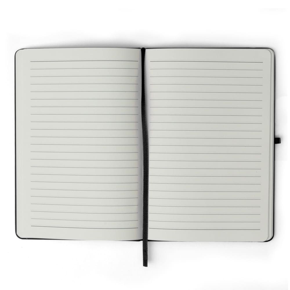 Caderneta emborrachada com porta caneta elástico em nylon, marcador de página em cetim e fita elástica de nylon para fechar. Contém aproximadamente 80 folhas pardas pautadas.