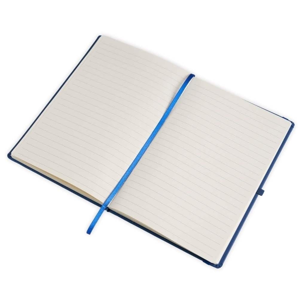 Caderneta em percalux com porta caneta, marcador de página em cetim e fita elástica para fechar. Contém aproximadamente 80 folhas com pauta.