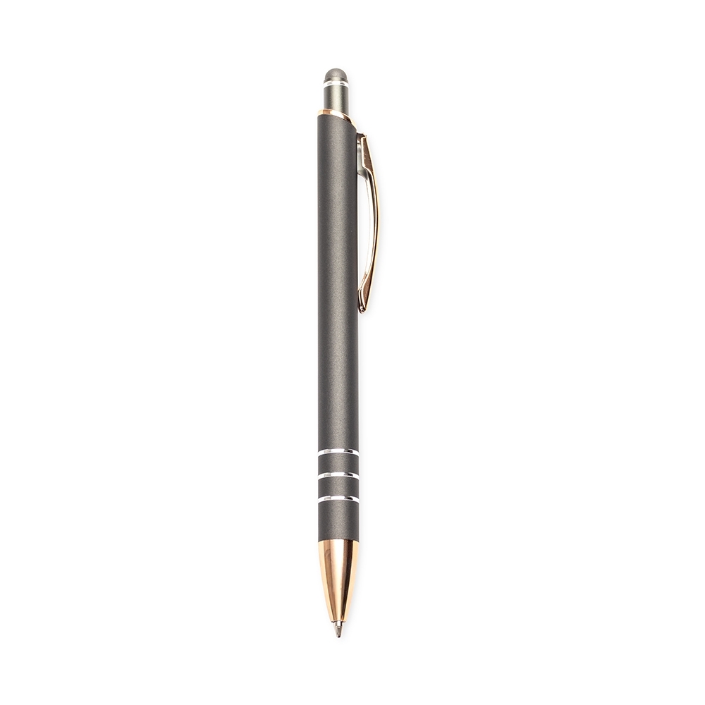 Caneta metálica com carga esferográfica de 1,0mm e acionamento por clique de revestimento emborrachado, ideal para interagir com telas sensíveis ao toque.