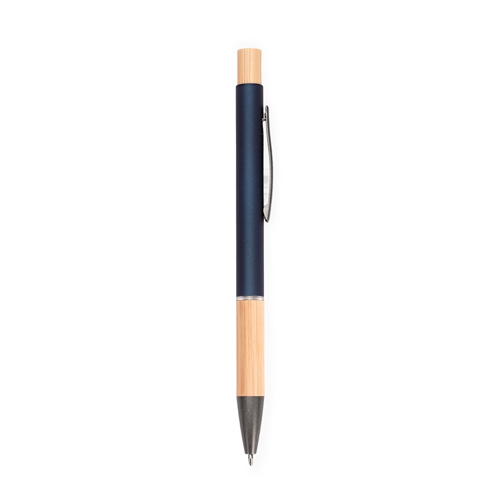 Caneta com carga esferográfica azul de 1.0mm. Apresenta corpo metálico, detalhes em bambu e acionamento por clique, oferecendo uma pegada leve para uma escrita precisa.
