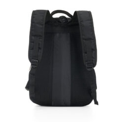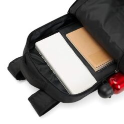 Mochila de poliéster 25 litros com três compartimentos, sendo o principal com bolso para notebook 156. A mochila possui bolsos laterais em malha, duas alças de mãos e área costada com revestimento espumado.