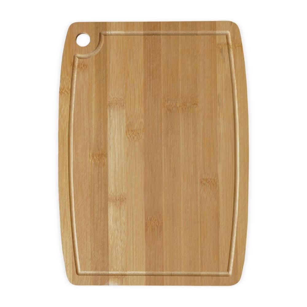 Tábua de corte em bambu com canaleta e acesso para gancho.
